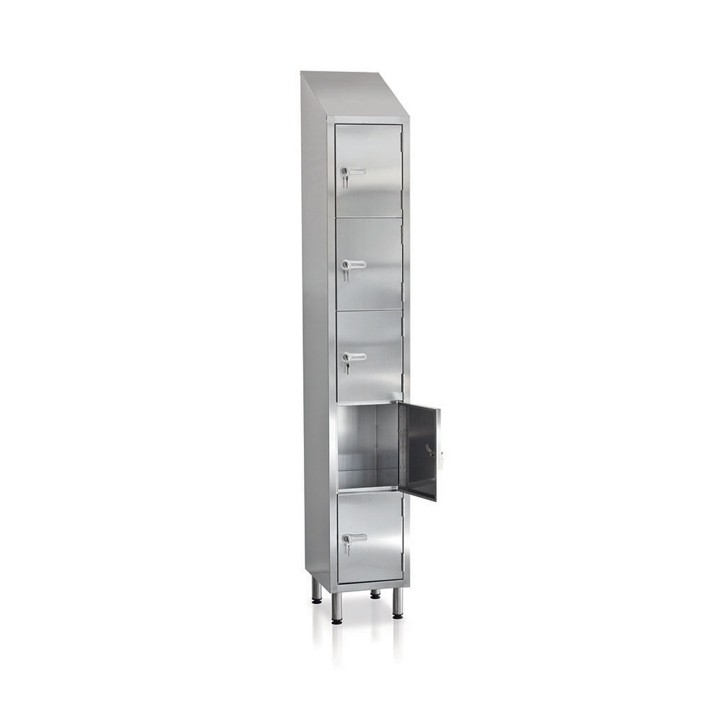 5-compartment cabinet in top quality ferritic stainless steel with satin finish SB, AISI 441 (EN 1.4509) thickness 8/10. Structural dustproof sloping roof and feet mm. 130 adjustable. In compliance with the provisions of the Decree of 10 December 2008 no.215. Sizes: mm. 325Lx400Dx1930+2140H.