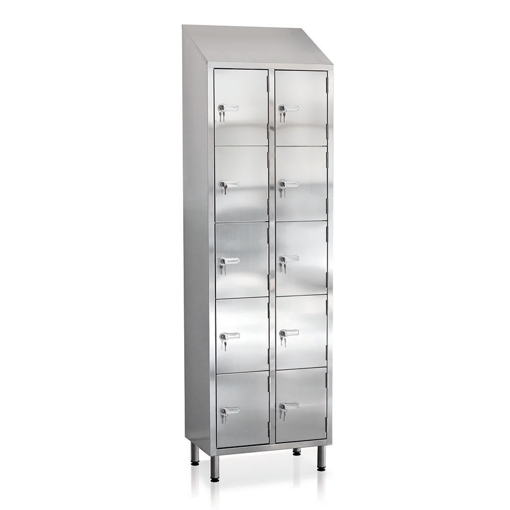 10-compartment cabinet in top quality ferritic stainless steel with satin finish SB, AISI 441 (EN 1.4509) thickness 8/10. Structural dustproof sloping roof and feet mm. 130 adjustable. In compliance with the provisions of the Decree of 10 December 2008 no.215. Sizes: mm. 615Lx400Dx1930+2140H.