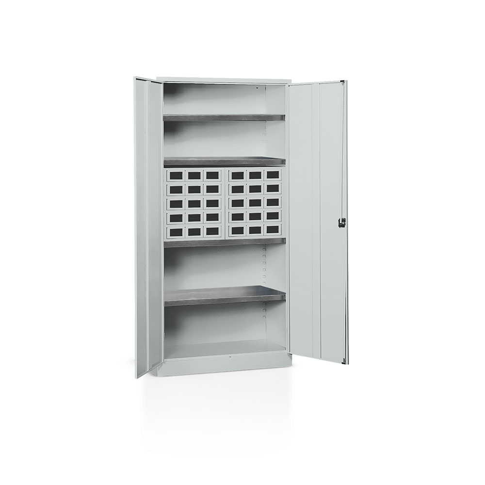 Cabinet in 8/10 thick sheet metal, hinged doors with lock, 4 galvanised adjustable shelves (capacity 100 kg) and 2 drawer units item E936 with 15 drawers in sheet metal mm. 130Lx300Dx70H with 30 dividers each Powder coating grey RAL 7038. Drawer unit dimension: mm. 456Lx325Dx496H. Cabinet dimensions: mm. 1000Lx400Dx2000H