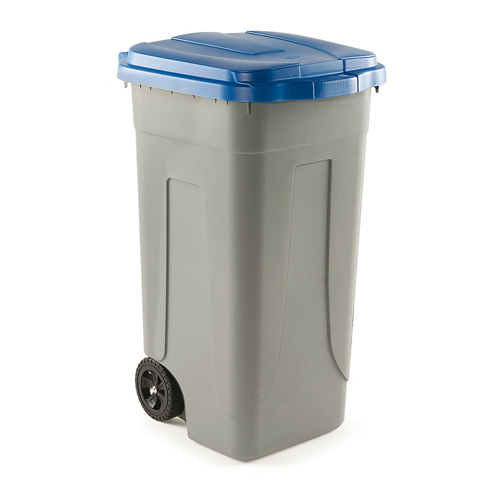 Bin with blue clip lid, for separate collection, in high density polypropylene, recyclable, resistant to chemical agents and not attackable by parasites. Wheels mm. 140 in rubber. Capacity 100 lt. Assembled. Grey. Sizes: mm. 490Lx540Dx850H.