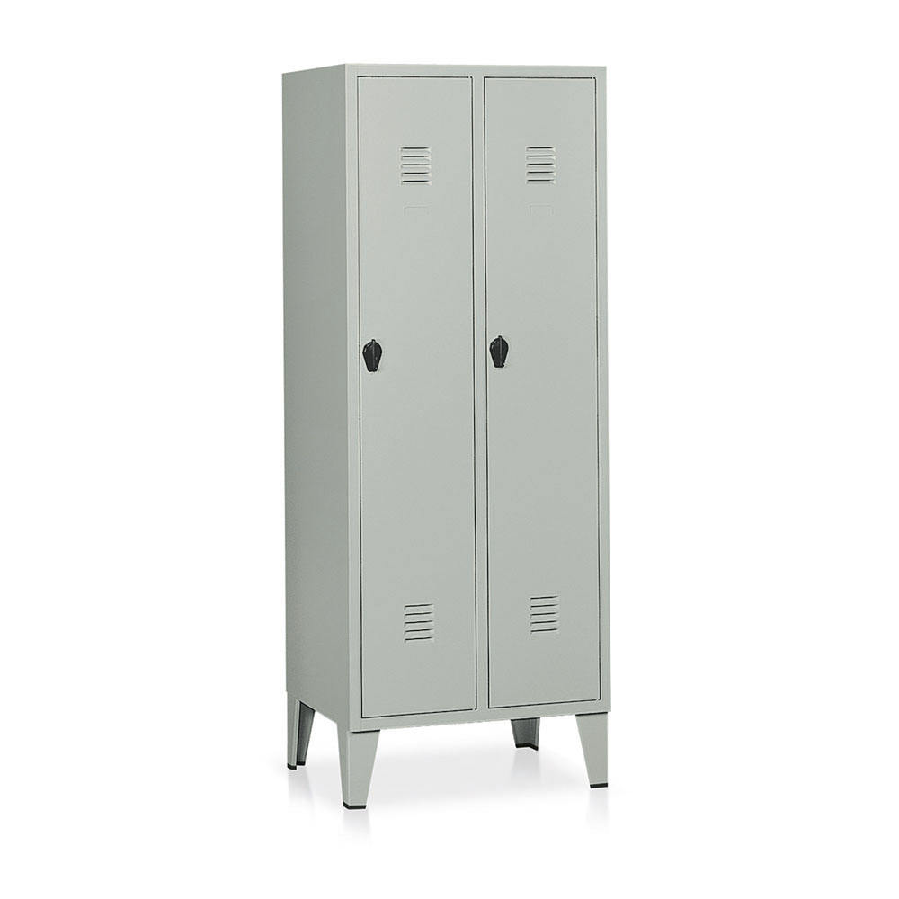 Locker with 2 compartments in sheet metal thickness 6-7/10. Each point with hanger, ring and umbrella tray, hat rack, 2 towel hooks. Reinforced and perforated doors for ventilation, tag holder and closure with padlockable plastic lug. Powder coating grey RAL 7038. Sizes: mm. 690Lx500Dx1800H.