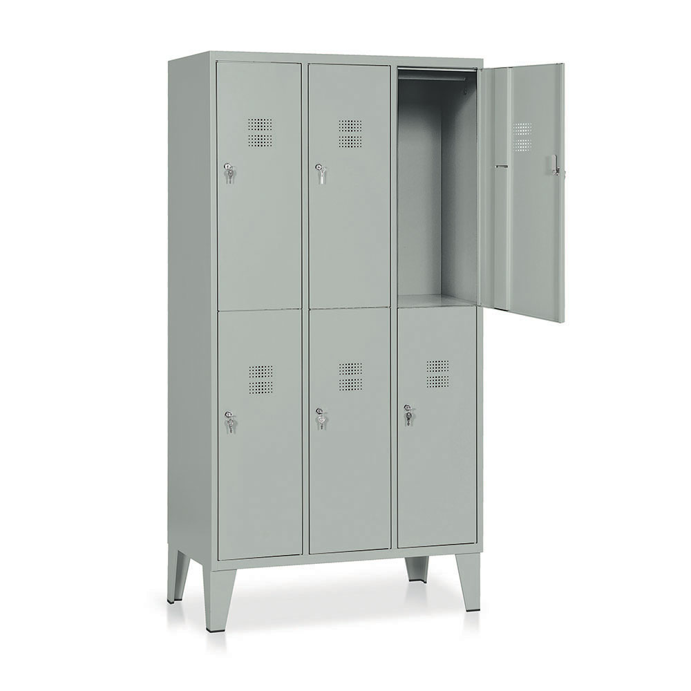Locker with 6 compartments in sheet metal thickness 6-7/10. Each unit with hanger and 2 towel hooks. Reinforced and perforated doors for ventilation, lockable. Powder coating grey RAL 7038. Sizes: mm. 905Lx500Dx1800H.