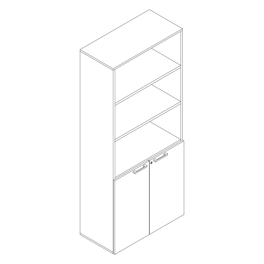 Melamine bookcase with hinged doors in the lower part and open in the upper part with 3 adjustable + 1 fixed shelf. Black structure, eucalyptus colour doors. Sizes: 900Lx450Dx2100H mm.