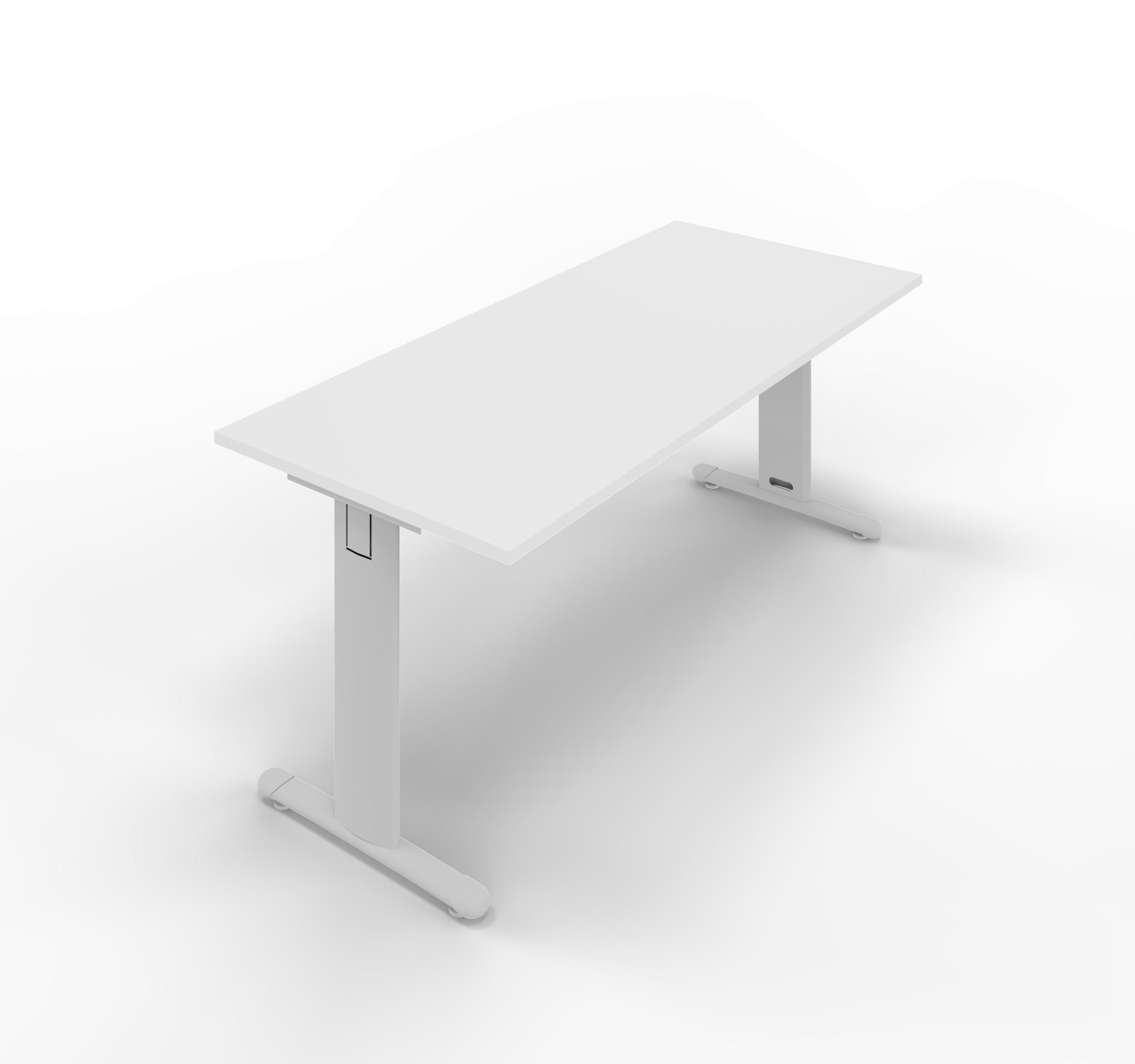 Melamine desk with standard T legs. White top thickness 25 mm, legs in painted steel embossed aluminium colour. Sizes: 1600Lx800Dx745H mm.