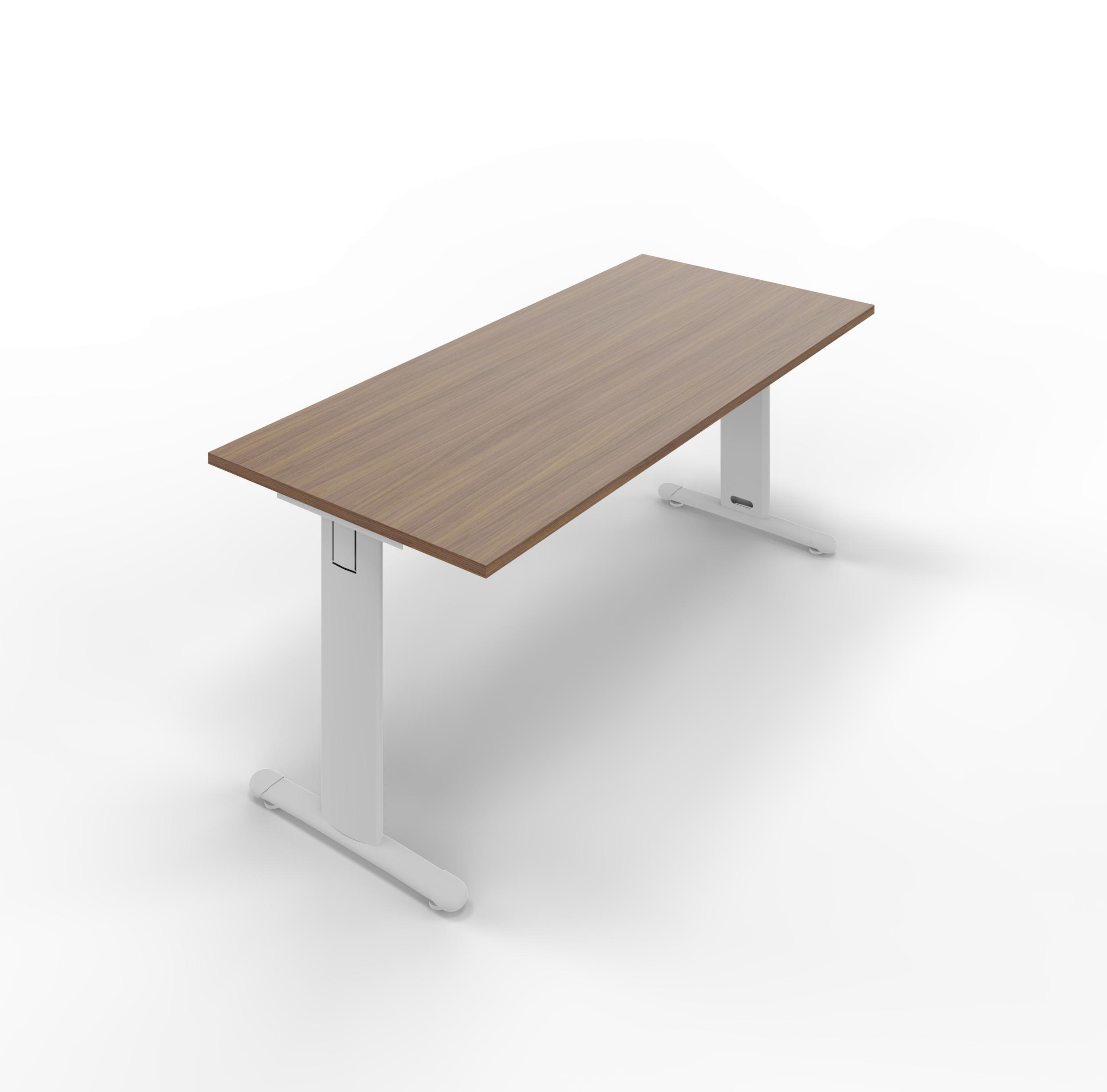 Melamine desk with standard T legs. Top walnut colour, legs in painted steel embossed aluminium colour. Sizes: 2000Lx800Dx745H mm.
