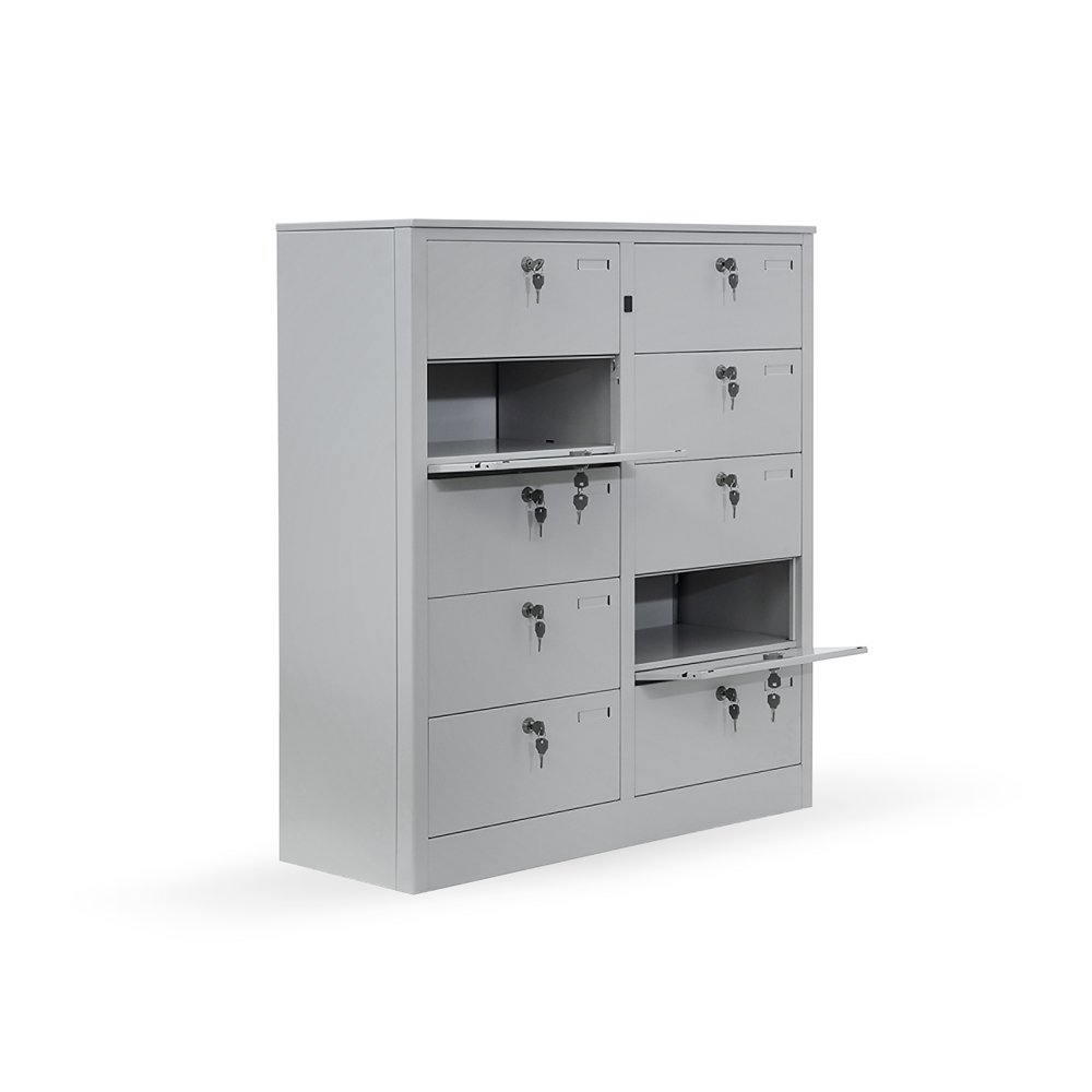 Metal folder-holder with 10 boxes with single block locking. Structure and top with rounded edges radius mm. 8. Epoxy powder painting grey RAL 7035. Effective dimensions boxes:385Lx340Dx155H mm. Sizes: 900Lx365Dx1060H mm.