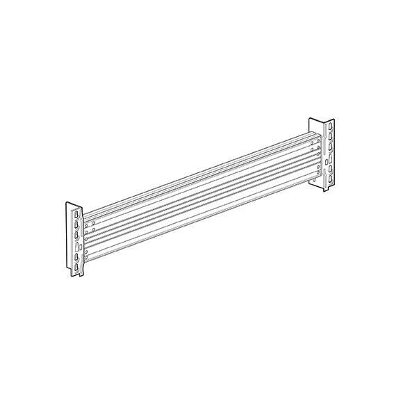 Pallet rack horizontal beams series 80-115 in sheet metal galvanised with double riveted connecting brackets and 2 safety hooks. Minimum height 1st level 87/187 mm, capacity per pair 2400 Kg. Sizes: mm 2200Lx45Dx106/181H.