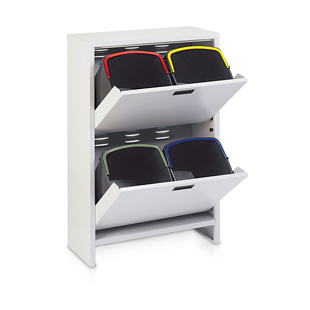 Locker in press-folded and electro-welded sheet metal 2 flaps with ventilation grid to promote the elimination of unpleasant odours, complete with 4 black polypropylene buckets with 4 different coloured handles. Capacity 80 lt. Powder coating grey RAL 7038. Sizes: mm. 650Lx260Dx970H.