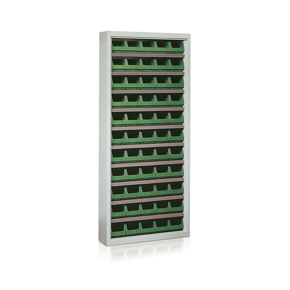 Cabinet with 55 container green item P251. Powder coating grey RAL 7038 for the shell, galvanised shelves. Sizes: mm. 840Lx270Dx2000H.