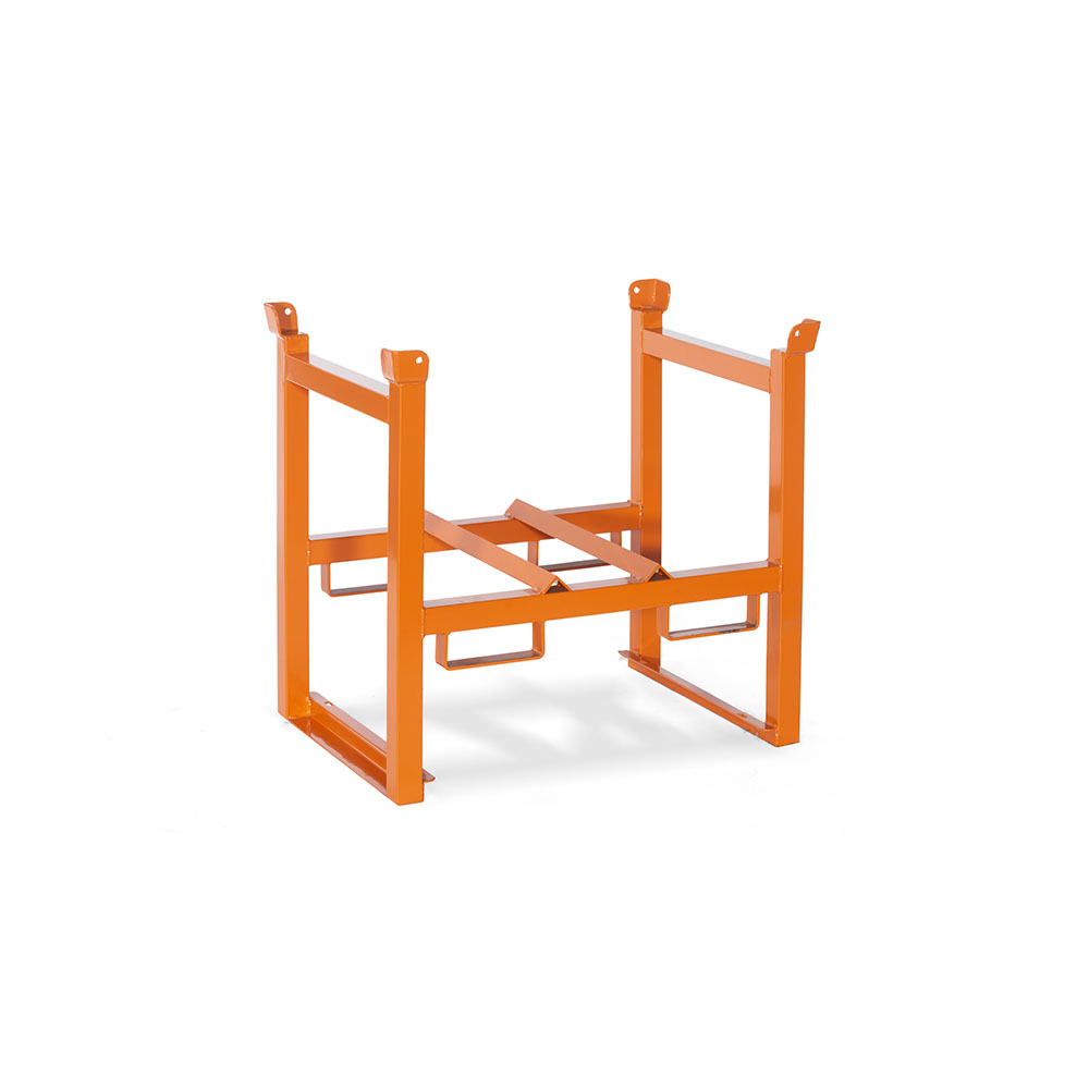 Tubular structure for 1 200 litre drum with 2 locking hooks, stackable 1+1, corner spacing mm. 210. Orange powder coating for outdoor use RAL 2004. Sizes: mm. 835Lx600Dx750H.