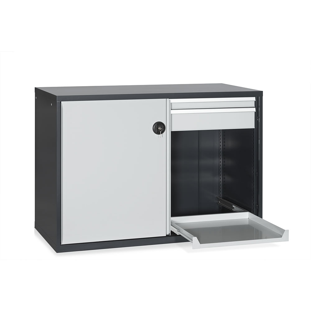 Tool cabinet sliding doors with 2 independent compartments in sheet metal With drawers on telescopic rails, 2 with front of mm. 75H, 2 of mm. 150H and 2 removable shelves. Powder coating of frames colour anthracite RAL 7016, colour doors and drawers light grey RAL 7035. Sizes: mm. 1430Lx780Dx1000H.