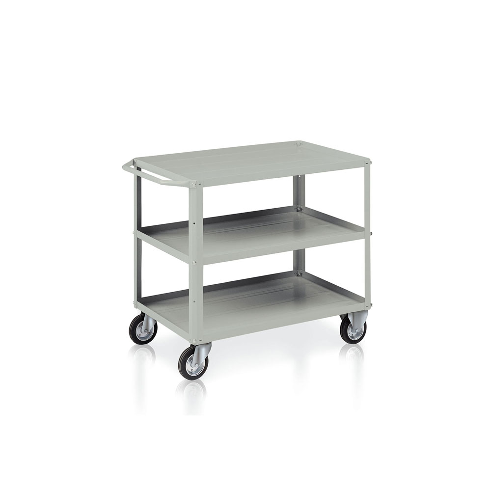 Sheet metal trolley with 3 tanks, 140 wheels with roller bearings, 2 fixed and 2 swivel. Capacity kg.120 each tank. Disassembled. Powder coating grey RAL 7038. Sizes trolley: mm. 1040Lx600Dx865H. Tray dimensions: mm. 930Lx600Dx30H.