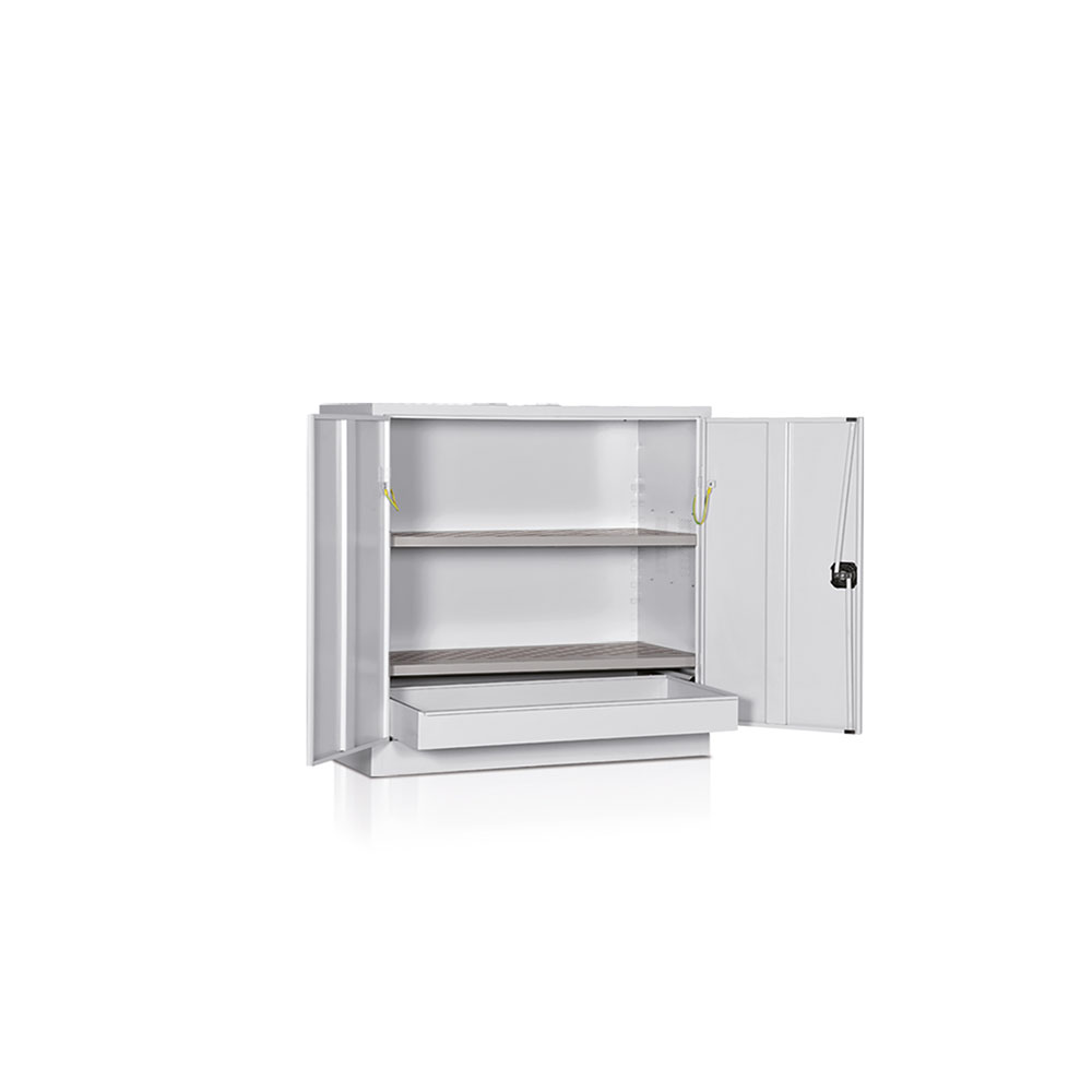 Armadio monoblocco in lamiera sp. 7-8/10 idoneo per lo stoccaggio di sostanze pericolose. Ante battenti rinforzate e serratura con maniglia, 2 piani zincati e forati, vasca di raccolta con capacità lt.40, feritoie d’aerazione con griglie frangifiamma nei fianchi e sul cielo, etichetta di segnaletica come da D.Lgs.81/08, predisposizione per la messa terra. Verniciatura a polvere grigio RAL 7038. Dim.: mm.1000x500x1000h. Dim. utili: mm.920x480x735h.