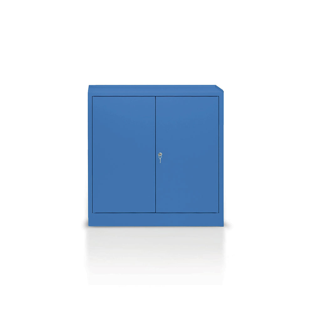 Armadietto in lamiera sp.8/10, ante battenti, 2 cassetti su guide senza cuscinetti e 2 piani mobili zincati (portata kg.100). Monoblocco. Verniciatura a polvere blu RAL 5015. Dim.: mm.1000x400x1000h.