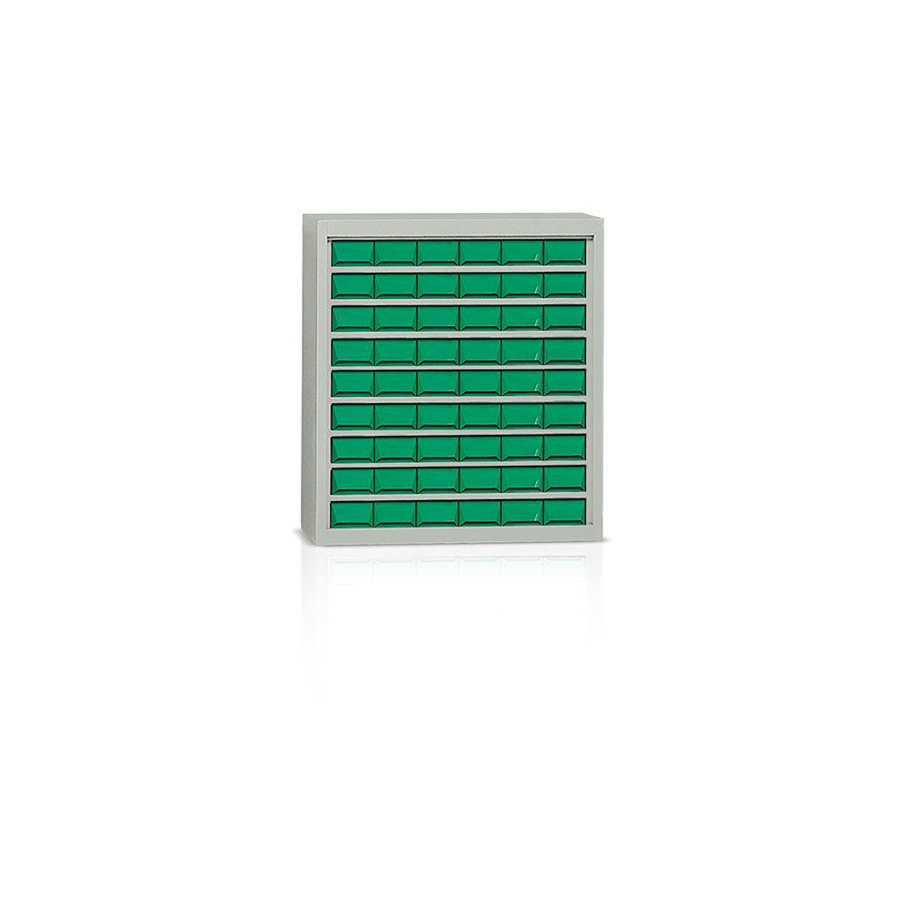 Armadio portaminuterie in lamiera sp. 8/10 a 54 cassetti in plastica verde di mm.130x300x70h e 108 separatori. Verniciatura a polvere grigio RAL 7038. Dim.: mm.900x355x1000h.
