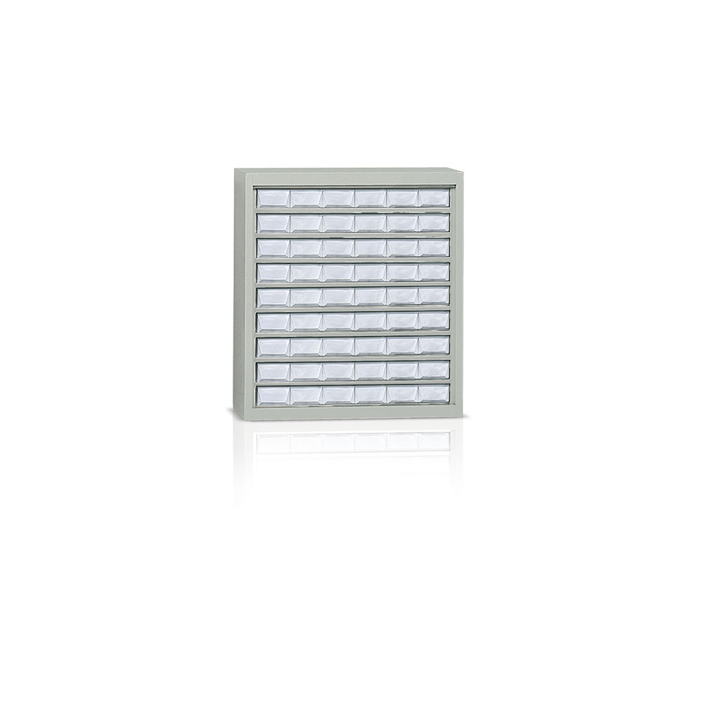 Armadio portaminuterie in lamiera sp. 8/10 a 54 cassetti in plastica traslucidi di mm.130x300x70h e 108 separatori. Verniciatura a polvere grigio RAL 7038. Dim.: mm.900x355x1000h.