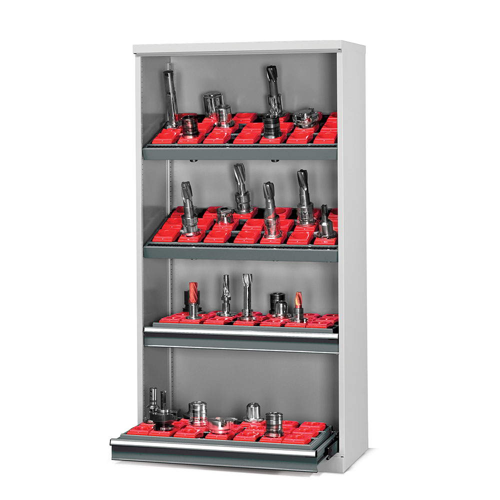 Armadio portautensili in lamiera a giorno, 2 telai portaboccole inclinati a 3 file, 2 cassetti a guide telescopiche con frontale di mm.100h corredati di telaio portaboccole a 3 file, 2 staffe per pavimento e 2 per parete. Portata kg.800. Verniciatura a polvere grigio chiaro RAL 7035 per l'armadio e i cassetti e grigio scuro RAL 7000 per i telai. Dim. esterne: mm.1023x555x2000h. Dim. utili: mm.998x500x1850h.