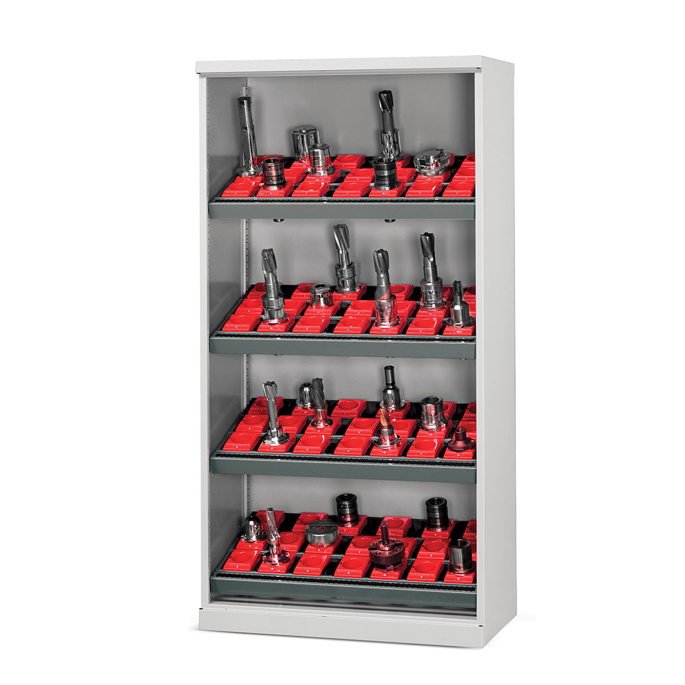 Armadio portautensili in lamiera a giorno, 4 telai portaboccole inclinati a 3 file, 2 staffe per pavimento e 2 per parete. Portata kg.800. Verniciatura a polvere grigio chiaro RAL 7035 per l'armadio e grigio scuro RAL 7000 per i telai. Dim. esterne: mm.1023x555x2000h. Dim. utili: mm.998x500x1850h.