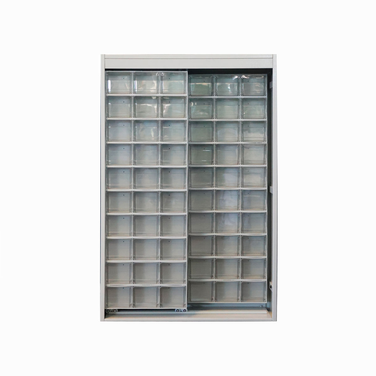 Armadio con pannelli, 2 fissi affiancati sul fondo e 1 scorrevole. Corredato di 30 cassettiere in PET grigio chiaro con 3 cassetti trasparenti art.P377GC. Montato. Verniciatura a polvere grigio chiaro RAL 7035. Dim.: mm.1270x400x1950h
