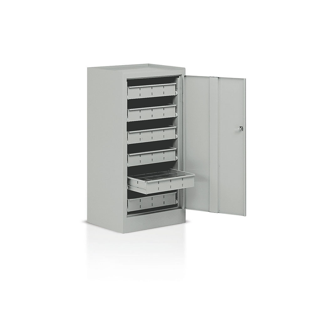 Armadio in lamiera sp.8/10, anta battente e 6 cassetti scorrevoli su guide con cuscinetti a sfera, divisi ad alveare da 6 separatori zincati che formano 16 scomparti di mm.92x85. Monoblocco. Verniciatura a polvere grigio RAL 7038. Dim.: mm.500x400x1000h.