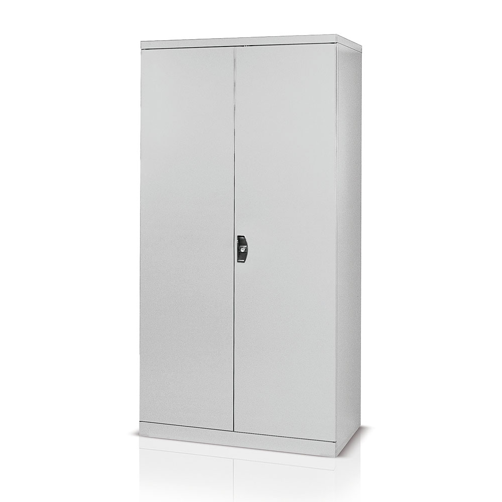 Armadio portautensili in lamiera ad ante battenti, 4 piani mobili zincati e 4 staffe (2 a pavimento e 2 a parete). Portata kg.800. Verniciatura a polvere grigio chiaro RAL 7035. Dim. esterne: mm.1023x555x2000h. Dim. utili: mm.998x500x1850h.