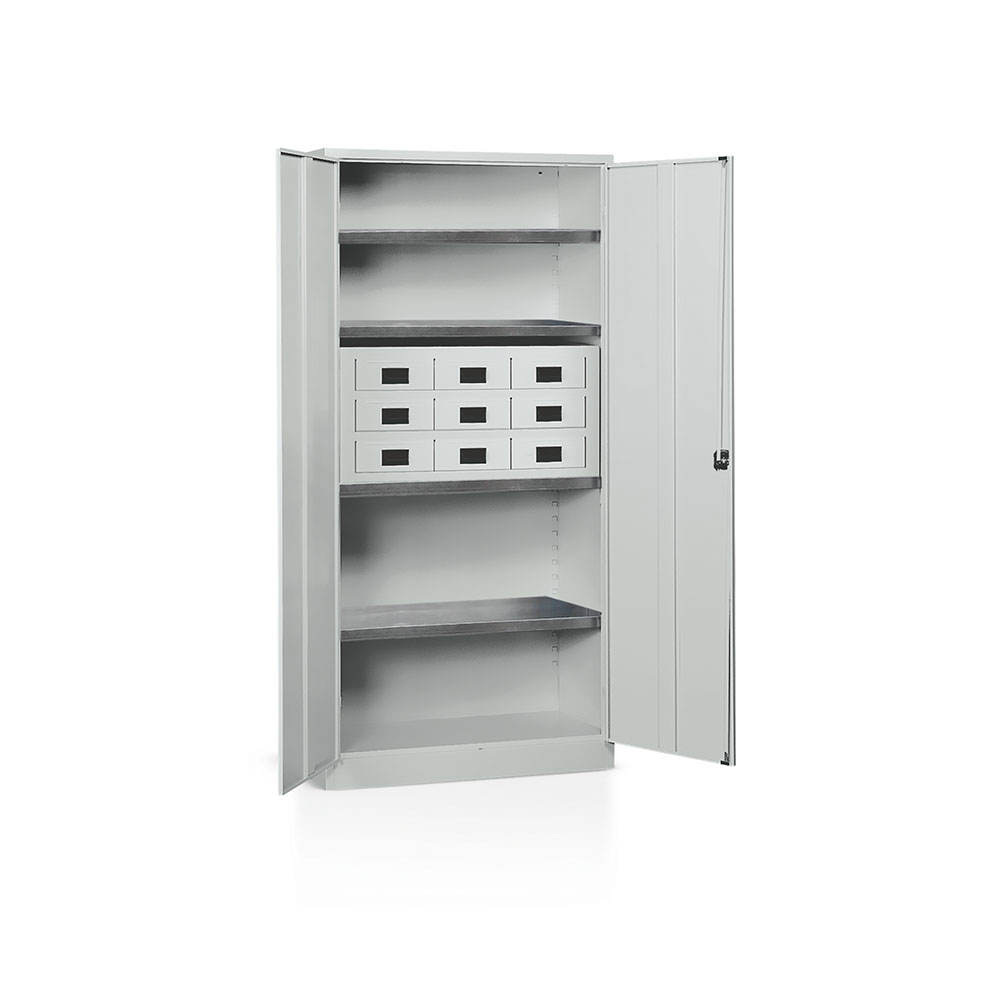Armadio in lamiera sp.8/10, ante battenti, serratura con aste, 4 piani mobili zincati (portata kg.100) e 1 cassettiera articolo E935 a 9 cassetti in lamiera di mm.260x300x95h con 18 separatori. Verniciatura a polvere grigio RAL 7038. Dim. cassettiera: mm.900x325x445h. Dim. armadio: mm.1000x400x2000h