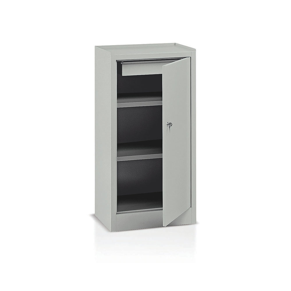 Armadietto in lamiera sp.8/10, anta battente, 1 cassetto su guide senza cuscinetti e 2 piani mobili zincati (portata kg.50). Monoblocco. Verniciatura a polvere grigio RAL 7038. Dim.: mm.500x400x1000h.