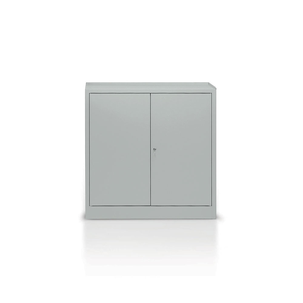 Armadietto in lamiera sp.8/10, ante battenti e 2 piani mobili zincati (portata kg.100). Monoblocco. Verniciatura a polvere grigio RAL 7038. Dim.: mm.1000x400x1000h.
