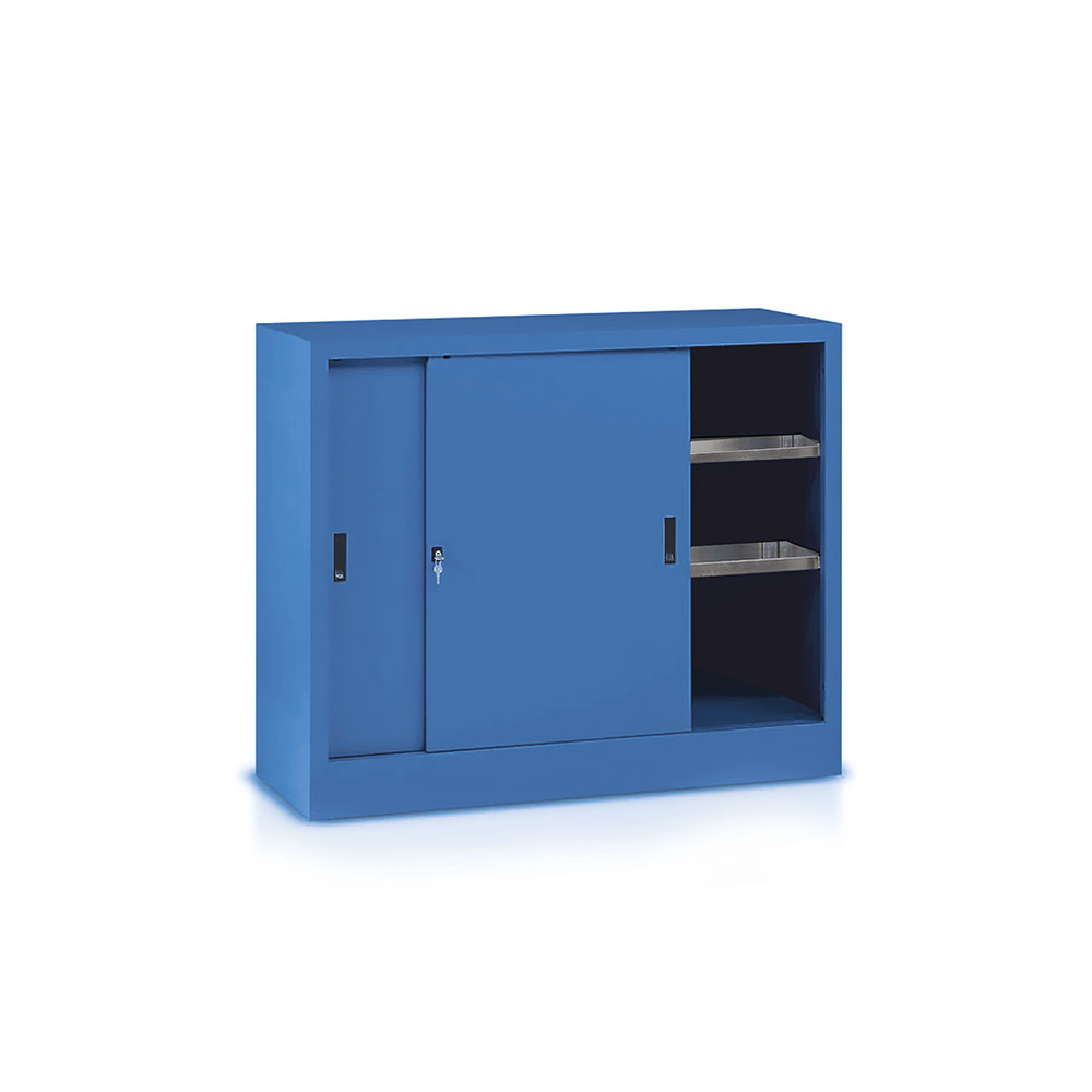 Armadio in lamiera sp.8/10, ante scorrevoli e 2 piani mobili zincati (portata kg.80). Monoblocco. Verniciatura a polvere blu RAL 5015. Dim.: mm.1200x500x1000h.