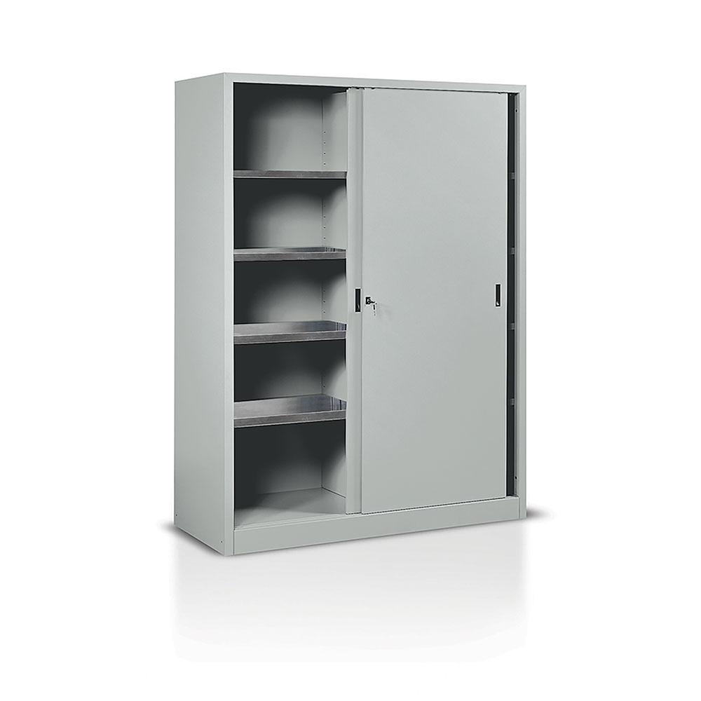 Armadio in lamiera sp.8/10, ante scorrevoli, tramezza e 4+4 piani mobili zincati (portata kg.80). Smontato. Verniciatura a polvere grigio RAL 7038. Dim.: mm.1500x600x2000h.