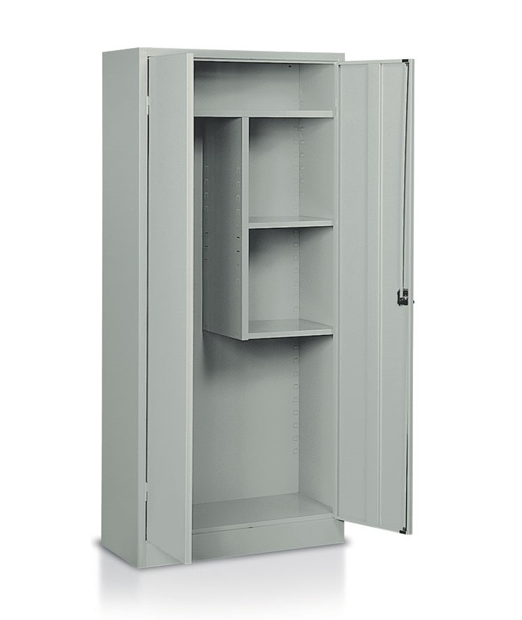 Armadio multiuso in lamiera sp. 7/10, ante battenti, serratura con aste, vano portascope e 3 piani mobili. Verniciatura a polvere grigio RAL 7038. Dim.: mm.800x400x1800h.