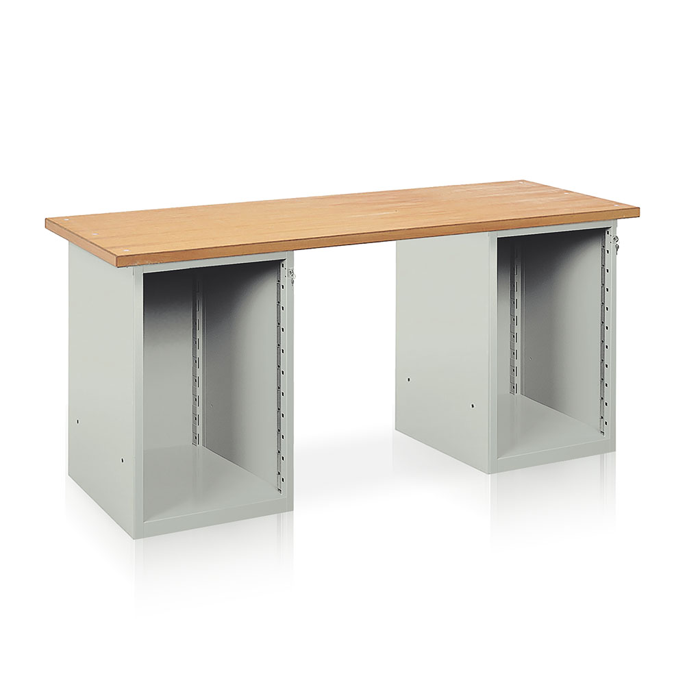 Banco da lavoro con piano in legno impiallacciato in noce tanganika sp. mm.40 e bordato in faggio, 2 cassettiere da attrezzare per mm.770h. Portata kg.1000. Smontato. Verniciatura a polvere grigio RAL 7038. Dim.: mm.2000x750x900h.