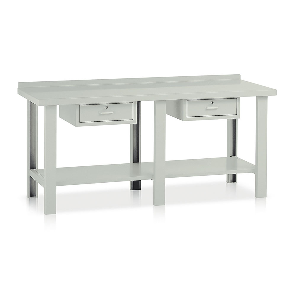 Banco da lavoro con piano in lamiera sp. 30/10, 3 fiancate e 1 sottopiano sagomato e rinforzato, 2 cassetti scorrevoli su guide con cuscinetti a sfera e serratura. Portata kg.1500. Smontato. Verniciatura a polvere grigio RAL 7038. Dim.: mm.2000x750x885h.