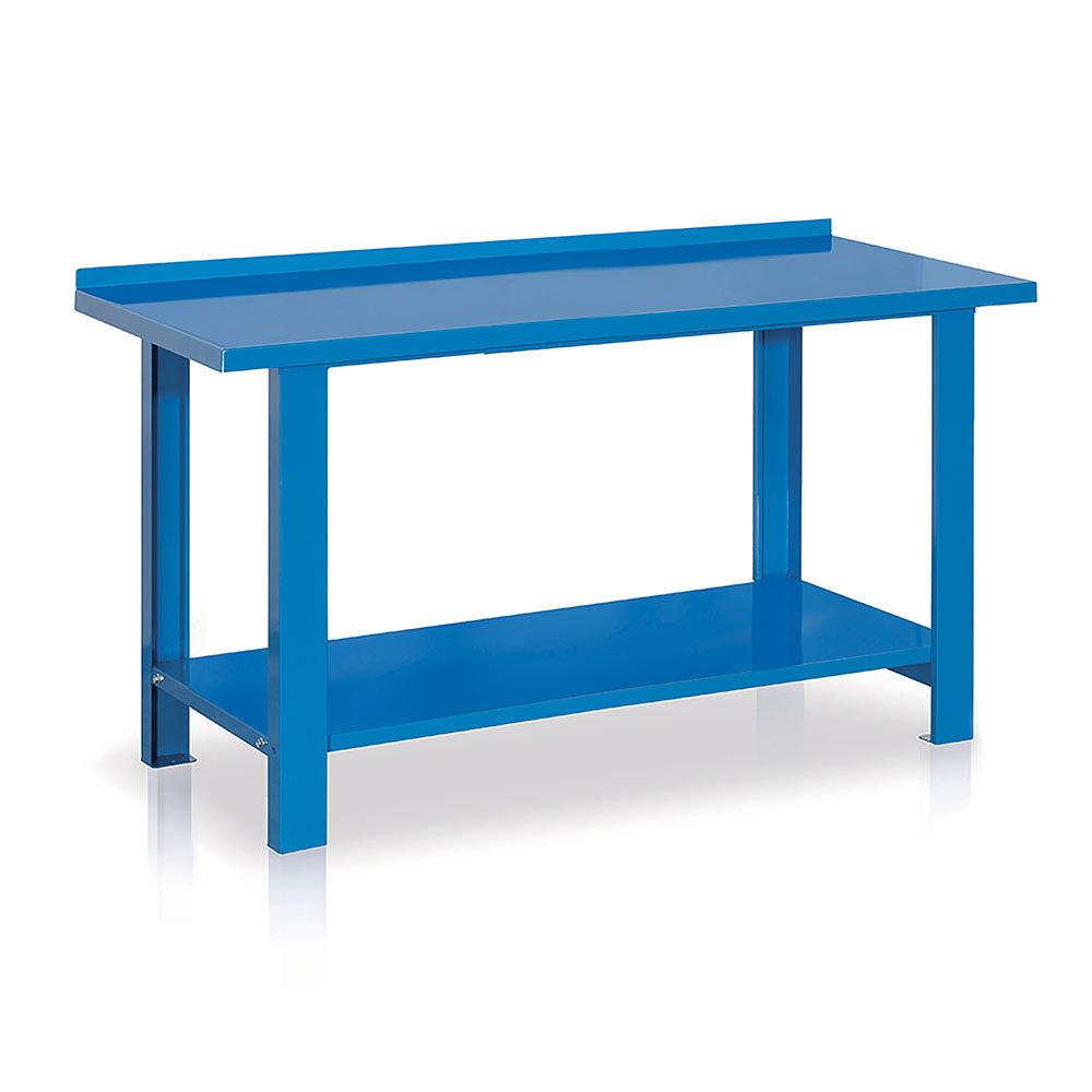 Banco da lavoro con piano in lamiera sp. 25/10, 2 fiancate e 1 sottopiano sagomato e rinforzato. Portata kg.1000. Smontato. Verniciatura a polvere blu RAL 5015. Dim.: mm.1500x670x860h.