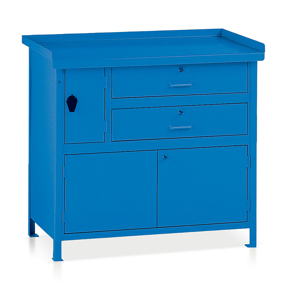 Banco da lavoro in lamiera con piano sp. 25/10, 2 cassetti scorrevoli su guide con cuscinetti a sfera e serratura, 1 vano laterale con nasello lucchettabile ed 1 vano inferiore con sportelli. Portata kg.1200 Verniciatura a polvere blu RAL 5015. Dim.: mm.1000x670x900h.