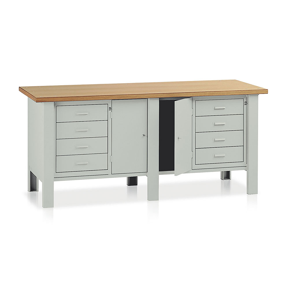 Banco da lavoro con piano in legno impiallacciato in noce tanganika sp.mm.40 e bordato in faggio. Struttura in lamiera pannellata con 3 fiancate, 1 sottopiano sagomato e rinforzato, 2 cassettiere a 4 cassetti scorrevoli su guide con cuscinetti a sfera e serratura con chiusura simultanea, 1 vano centrale con sportelli. Portata kg.1000. Verniciatura a polvere grigio RAL 7038. Dim.: mm.2000x750x900h.