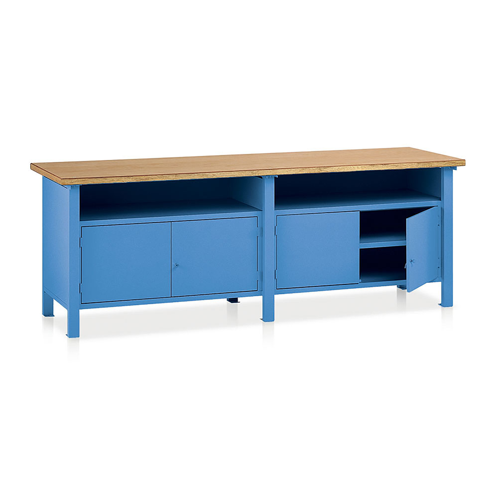 Banco da lavoro con piano in legno impiallacciato in noce tanganika sp.mm.40 e bordato in faggio. Struttura in lamiera pannellata con 3 fiancate, 1 sottopiano sagomato e rinforzato, 2 vani a giorno e 2 vani con sportelli e pianetti fissi. Portata kg.1200. Smontato. Verniciatura a polvere Blu RAL 5015. Dim.: mm.2500x750x900h.