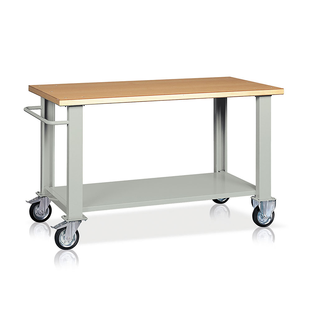 Banco da lavoro con piano in legno impiallacciato in noce tanganika sp.mm.40 e bordato in faggio, 2 fiancate, 1 sottopiano sagomato e rinforzato, 1 manico e ruote mm.150 con cuscinetti, 2 fisse e 2 girevoli frenanti. Portata kg.450. Smontato. Verniciatura a polvere grigio RAL 7038. Dim.: mm.2000x750x900h.