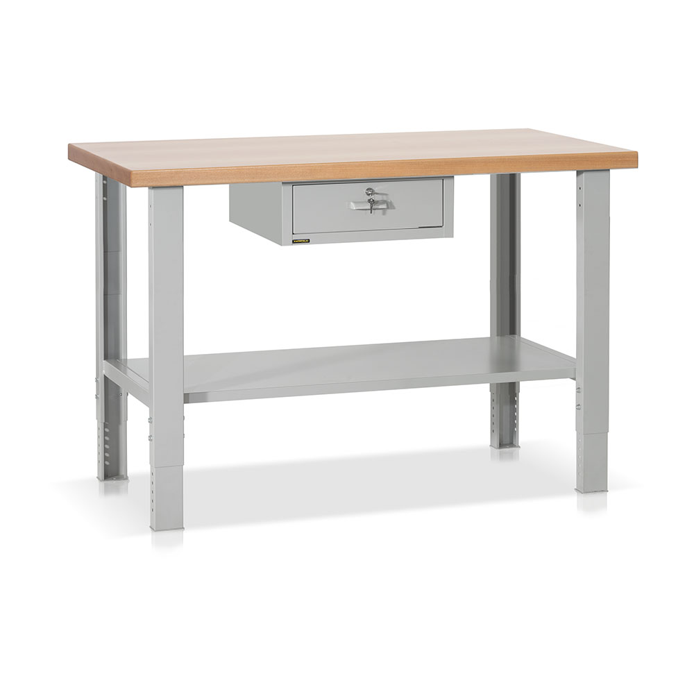Banco elevabile con piano in legno impiallacciato in noce tanganika sp.mm.40 e bordato in faggio, 2 fiancate con innesto a scorrimento interno per la regolazione in altezza, sottopiano sagomato e rinforzato e 1 cassetto scorrevole su guide con cuscinetti a sfera e serratura. Portata kg. 900. Smontato. Verniciatura a polvere grigio RAL 7038. Dim.: mm.1500x750x715/1090h.