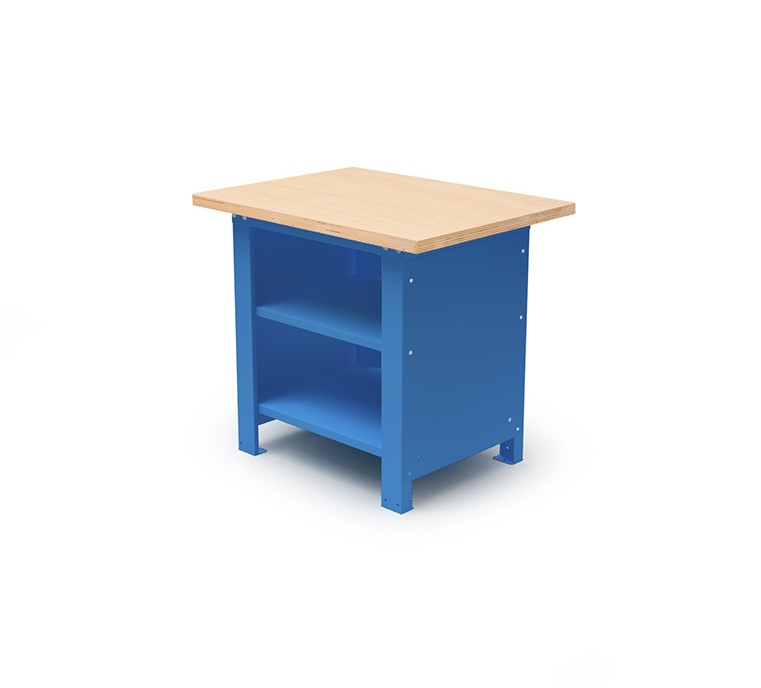 Banco da lavoro con piano in multistrati di faggio sp. mm.30, pannellature su 3 lati, 2 fiancate, 1 pianetto e 1 sottopiano sagomato e rinforzato.Portata kg.1000. Smontato. Verniciatura a polvere blu RAL 5015. Dim.: mm.1024x750x880h.