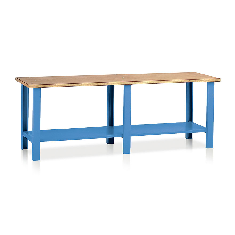 Banco da lavoro con piano in legno impiallacciato in noce tanganika sp.mm.40 e bordato in faggio, 3 fiancate e 1 sottopiano sagomato e rinforzato. Portata kg.1200. Smontato. Verniciatura a polvere blu RAL 5015. Dim.: mm.2500x750x900h.