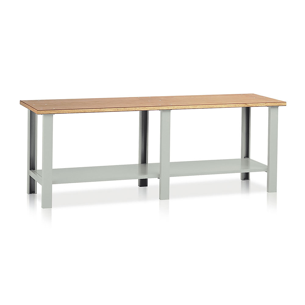 Banco da lavoro con piano in legno impiallacciato in noce tanganika sp.mm.40 e bordato in faggio, 3 fiancate e 1 sottopiano sagomato e rinforzato. Portata kg.1200. Smontato. Verniciatura a polvere grigio RAL 7038. Dim.: mm.2500x750x900h.