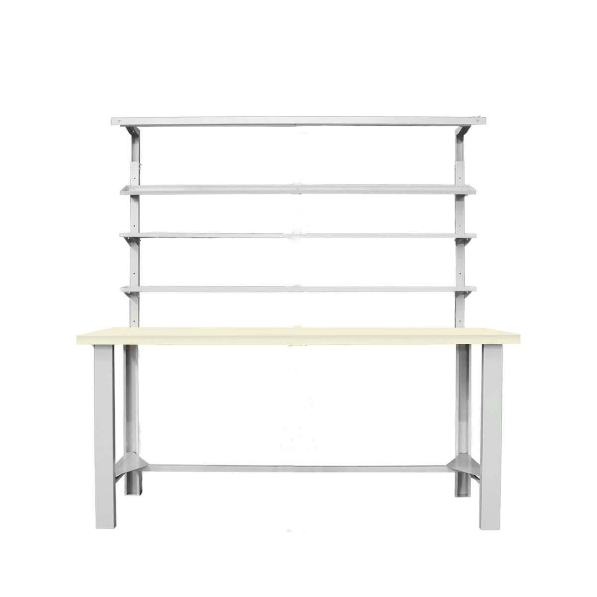 Banco da lavoro con piano sp.mm.29 in laminato plastico avorio, bordato in ABS, 2 fiancate, traverso poggiapiedi, 3 mensole prof.170 e luce led. Portata kg.1000. Smontato. Verniciatura a polvere grigio RAL 7038. Dim.: mm.1500x840x890/1980h.
