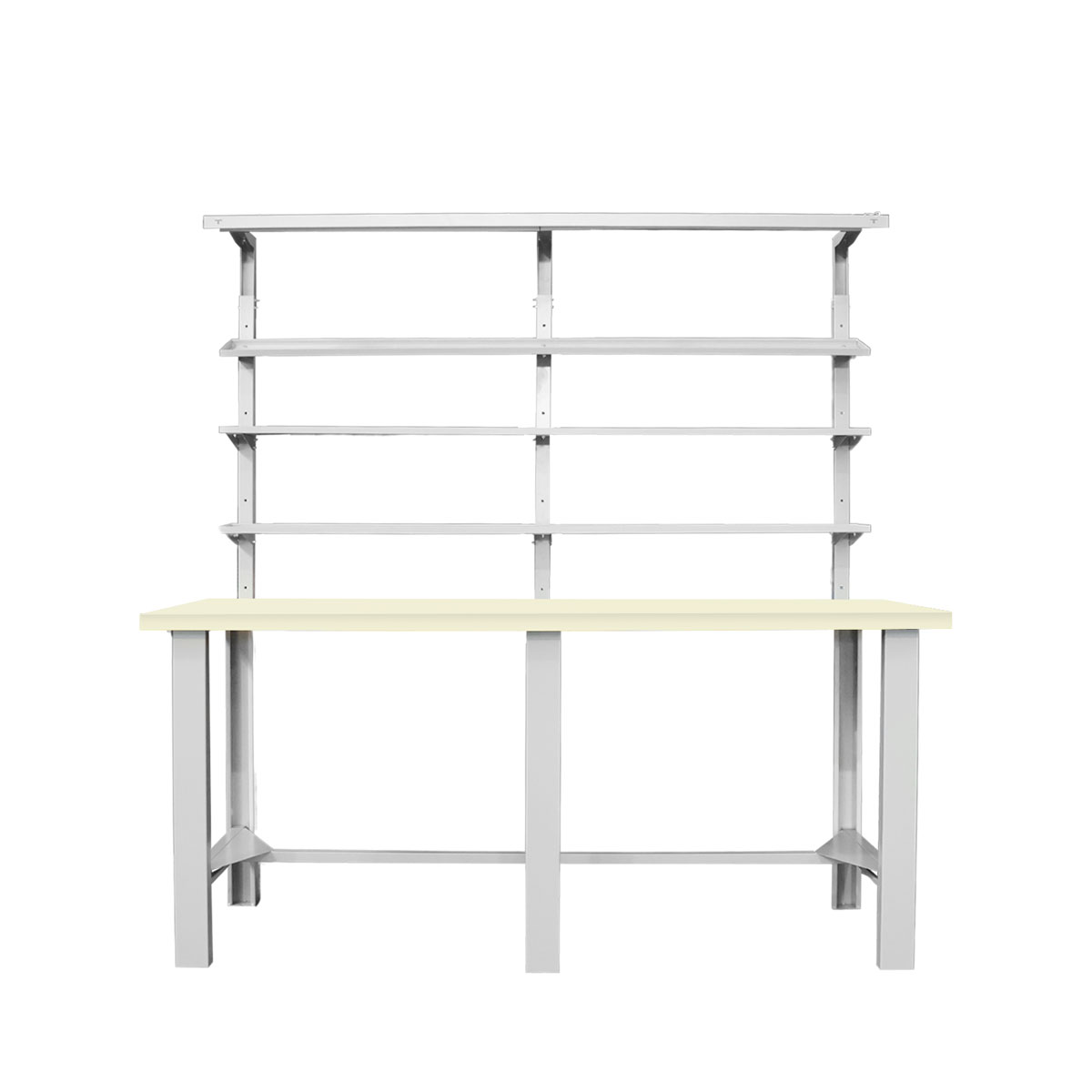 Banco da lavoro con piano sp.mm.29 in laminato plastico avorio, bordato in ABS, 3 fiancate, traverso poggiapiedi, 3 mensole prof.170 e luce led. Portata kg.1000. Smontato. Verniciatura a polvere grigio RAL 7038. Dim.: mm.2000x840x890/1980h.