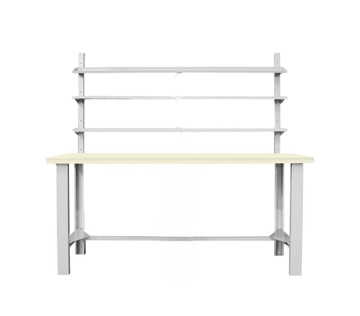 Banco da lavoro con piano sp.mm.29 in laminato plastico avorio, bordato in ABS, 2 fiancate, traverso poggiapiedi e 3 mensole prof.170. Portata kg.1000. Smontato. Verniciatura a polvere grigio RAL 7038. Dim.: mm.1500x840x890/1800h.
