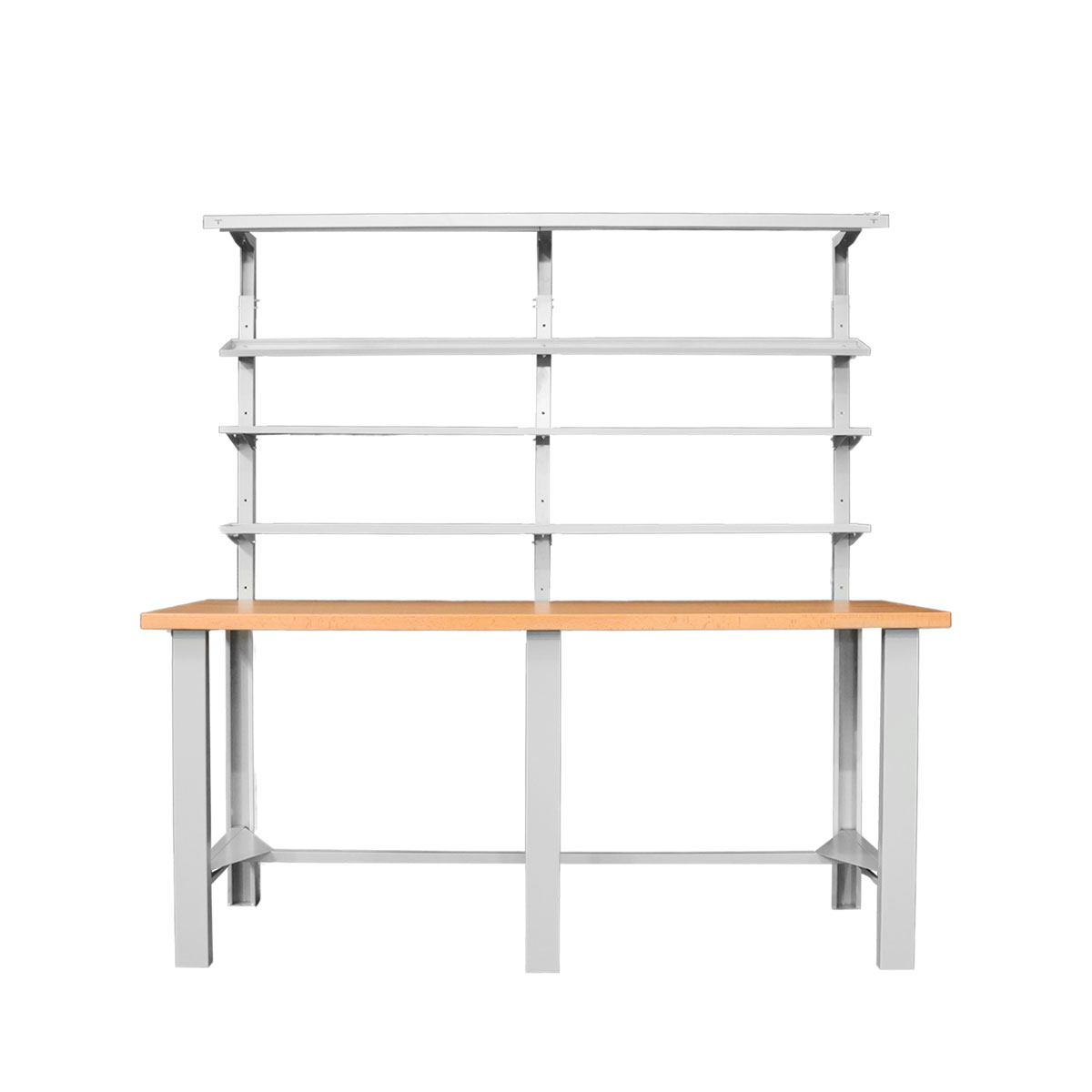 Banco da lavoro con piano in legno sp.mm.40, 3 fiancate, traverso poggiapiede, 3 mensole e lampada. Portata kg.1000. Smontato. Grigio RAL 7038. Dim.: mm.2000x790x900/1980h.