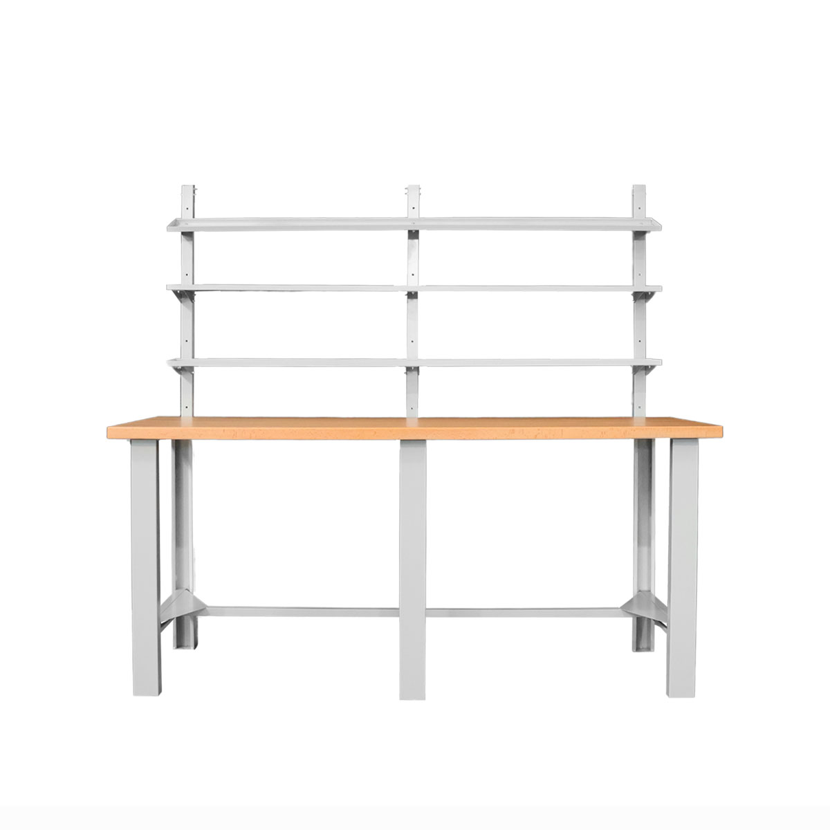 Banco da lavoro con piano in legno sp.mm.40, 3 fiancate, traverso poggiapiedi e 3 mensole. Portata kg.1000. Smontato. Grigio RAL 7038. Dim.: mm.2000x790x900/1800h.