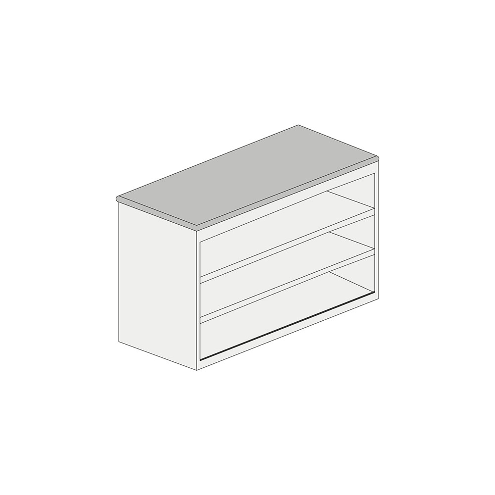 Banco vendita in lamiera con piano in laminato bucciato colore grigio sp. mm.40 e bordato in ABS colore nero e 2 piani interni. Verniciatura a polvere colore grigio chiaro RAL 7035 per la struttura e blu scuro RAL 5010 per il pannello frontale. Montato. Dim. mm.2000x640x1030h.