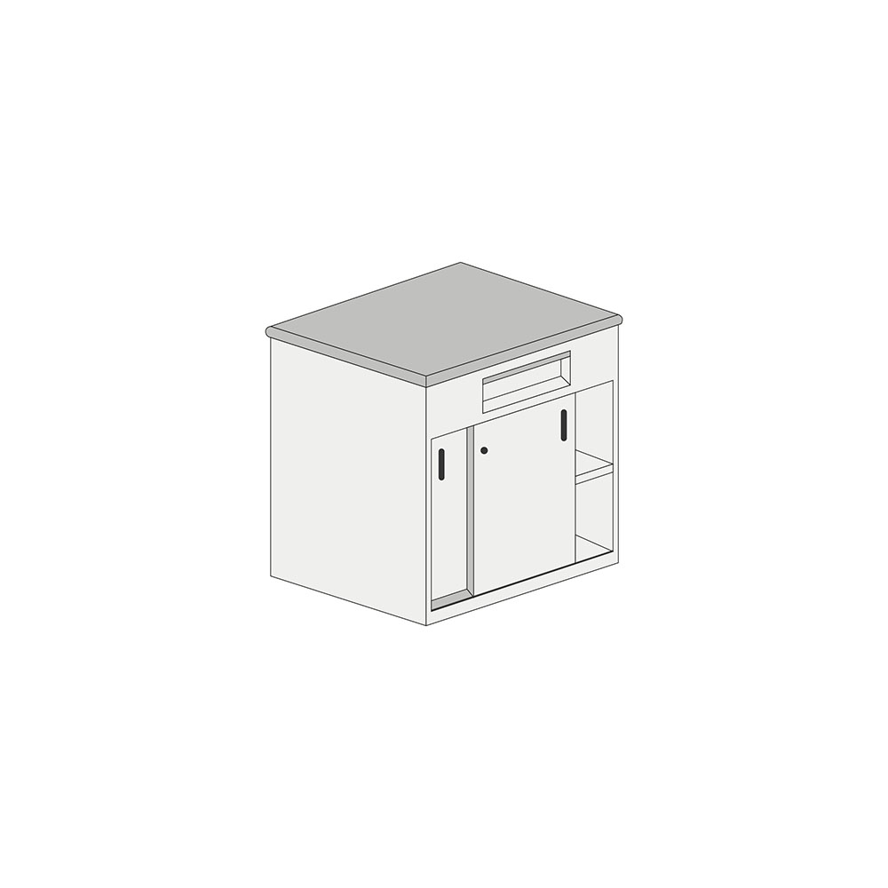 Banco vendita in lamiera con piano in laminato bucciato colore grigio sp. mm.40 e bordato in ABS colore nero, ante scorrevoli, 1 piano interno e 1 cassetto con frontale mm.140, portata kg.40, scorrevole su guide telescopiche a sfera. Verniciatura a polvere colore grigio chiaro RAL 7035 per la struttura e blu scuro RAL 5010 per il pannello frontale. Montato. Dim.: mm.1000x640x1030h.
