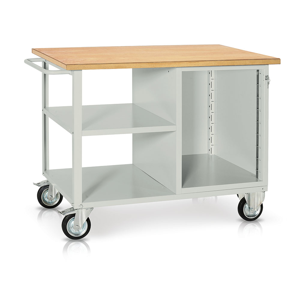 Banco da lavoro con piano in legno impiallacciato in noce tanganika sp.mm.40 e bordato in faggio, 1 fiancata, 1 sottopiano sagomato e rinforzato, 1 piano intermedio fisso, manico e 1 cassettiera da attrezzare per mm.630h. Ruote mm.150 con cuscinetti, 2 fisse e 2 girevoli frenanti. Portata kg.450. Montato. Verniciatura a polvere grigio RAL 7038. Dim.: mm.1200x750x950h.
